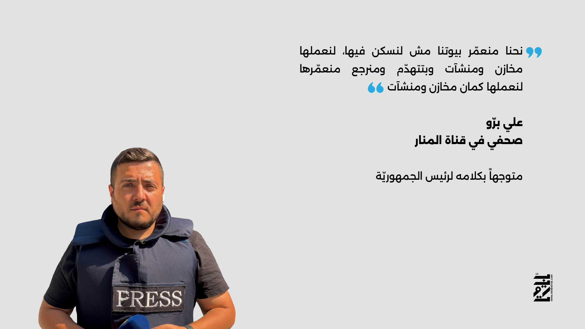 فقد نشر علي برّو، العامل في كلٍّ من قناة الميادين وقناة المنار، مقطع فيديو قبل أن يعود ويمسحه لاحقاً، تضمن كلاماً مفاده أن المنازل كلّها تُعدّ مستودعات تابعة لحزب الله. هذا التصريح أثار غضباً كبيراً في الأوساط اللبنانية عموماً، وفي البيئة الشيعية خصوصاً، إذ اعتبر كثيرون أن مثل هذا الكلام المتهوّر يقوّض الجهود الرسمية لحماية المدنيين، ويمنح إسرائيل ذريعة لتوسيع دائرة الاستهداف أو استئناف القصف.